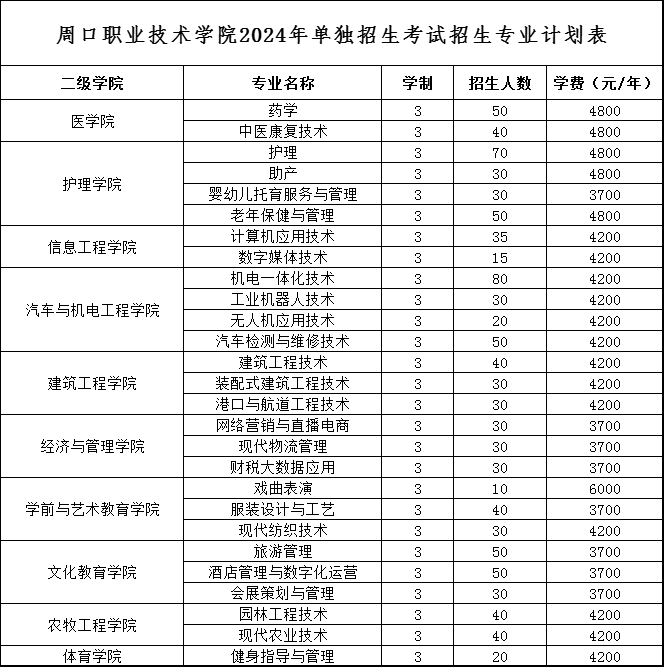 图片图片1.我校2024年高职单独考试招生安排招生计划1000人,招生专业及分专业计划以河南省教育厅审核批复后公布的高职单招招生章程为准。2.我校2024年高职单招针对退役士兵单列计划30人,单列计划招生专业为计算机应用技术、机电一体化技术、中医康复技术、汽车检测与维修技术、装配式建筑工程技术五个专业,符合退役士兵资格的考生须在单列专业内选择填报专业志愿。我校单招录取的退役士兵考生须将档案转至学校,全日制在校学习。